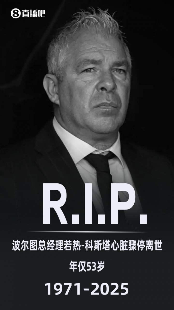 08月05日讯 多家葡萄牙媒体突发报道,波尔图总经理、俱乐部传奇人物若热-科斯塔因心脏骤停不幸去世,年仅53岁。随后波尔图官方确认了这一消息。