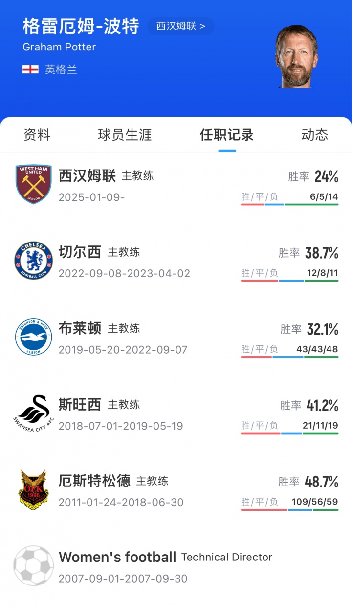 波特于2025年1月接任西汉姆主帅,上任25场仅取得6胜。西汉姆联新赛季英超开赛5轮1胜4负,身陷降级区。
